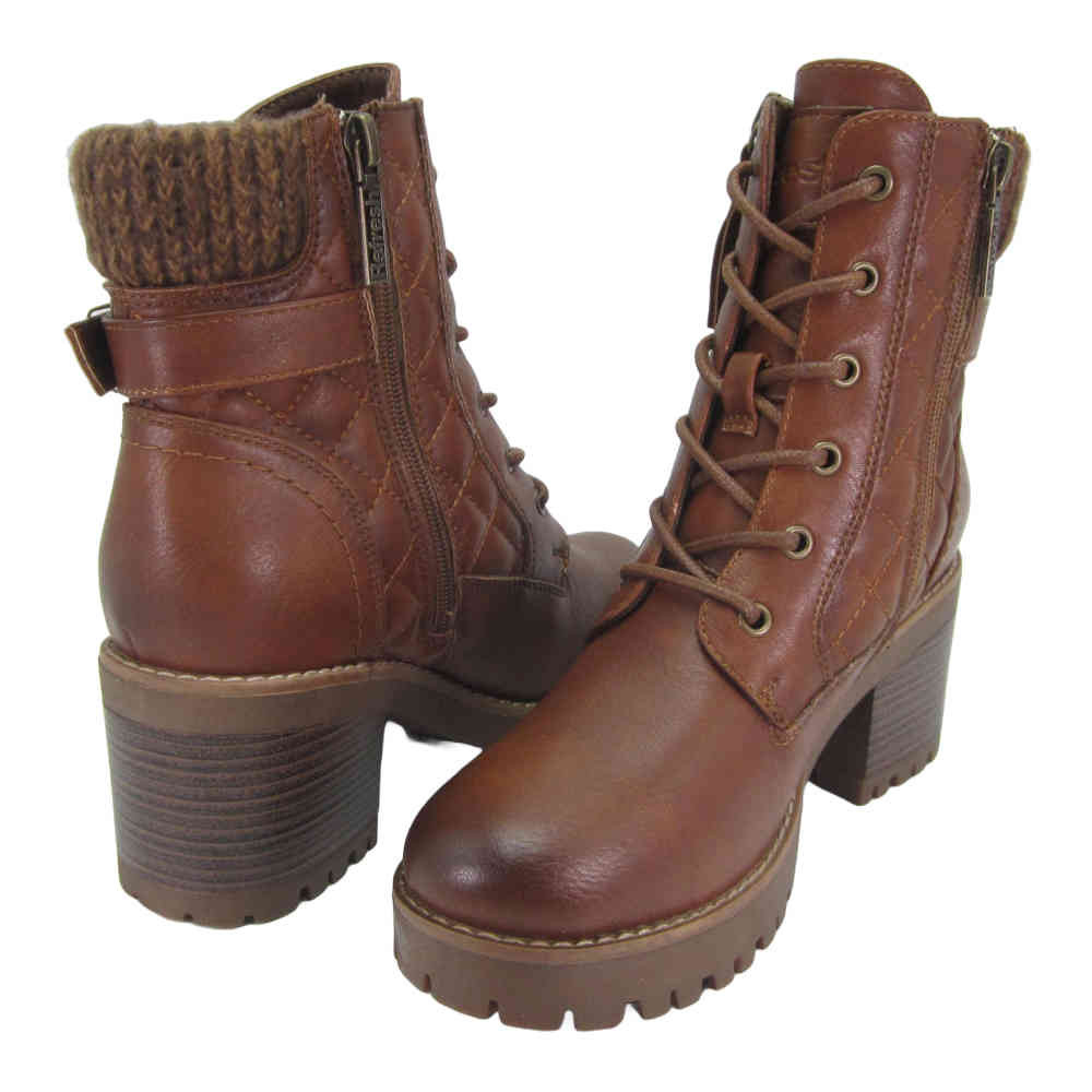 Botín de mujer, de la marca Refresh. Fabricado en material que imita la piel. Cierre mediante cremallera lateral y cordones para mayor ajuste y comodidad. Correa con hebilla decorativa. Collarín de pelito, para dar un toque montañero. Piso track con 8 cm y plataforma delantera para mayor comodidad. Este modelo ha obtenido el certificado vegano por la organización mundial PETA (Organización de los derechos de los animales).