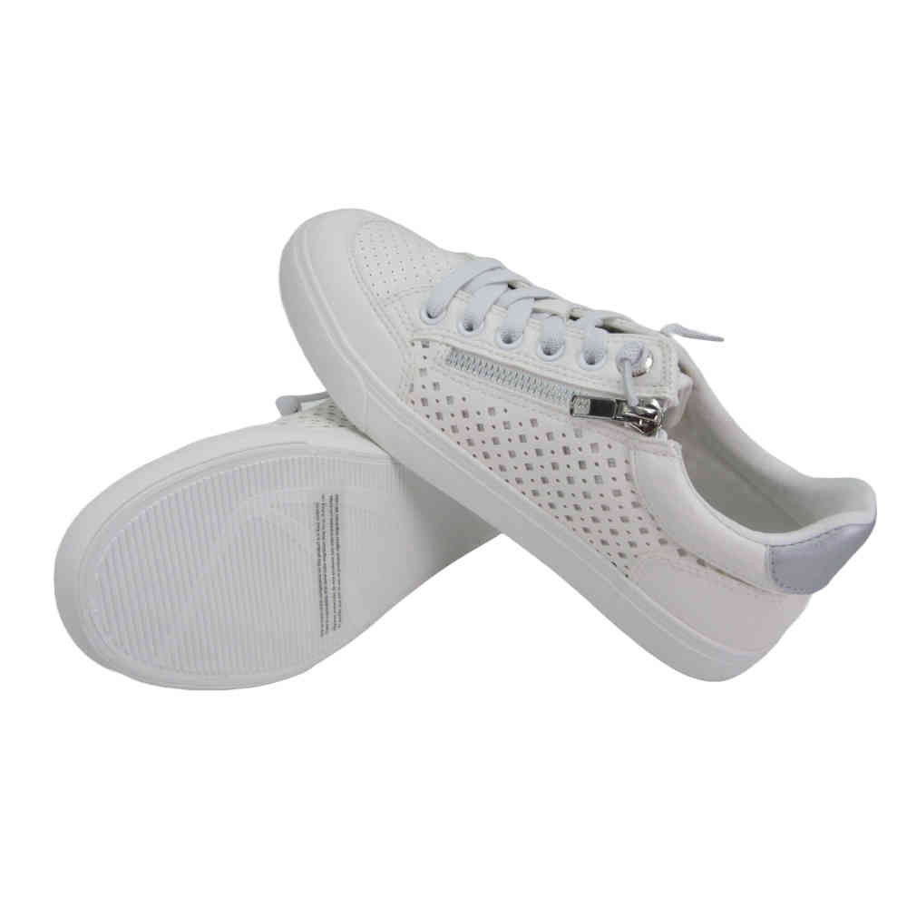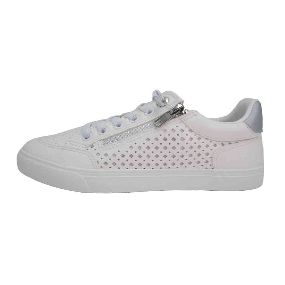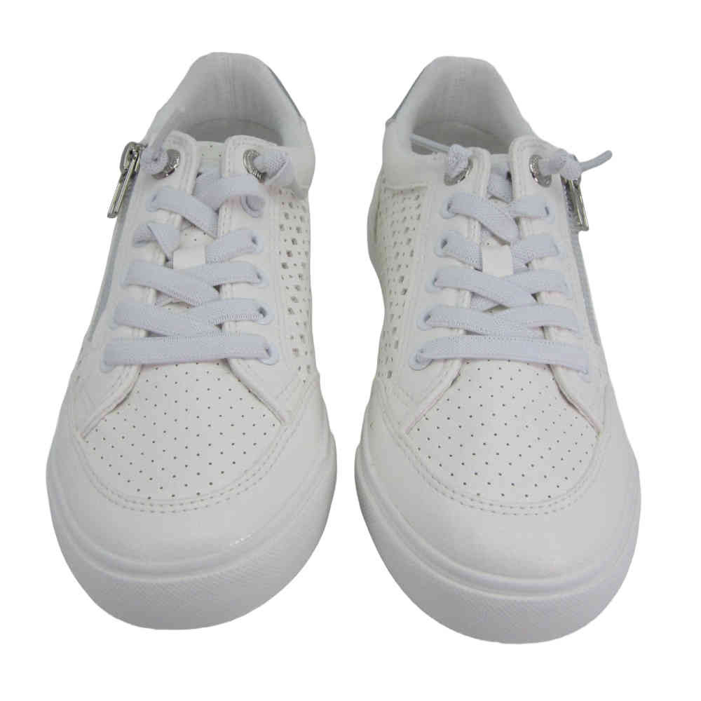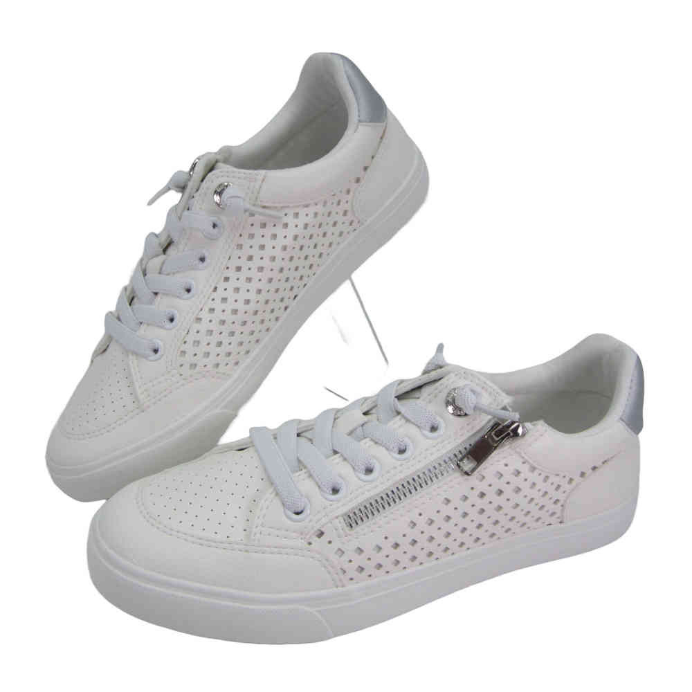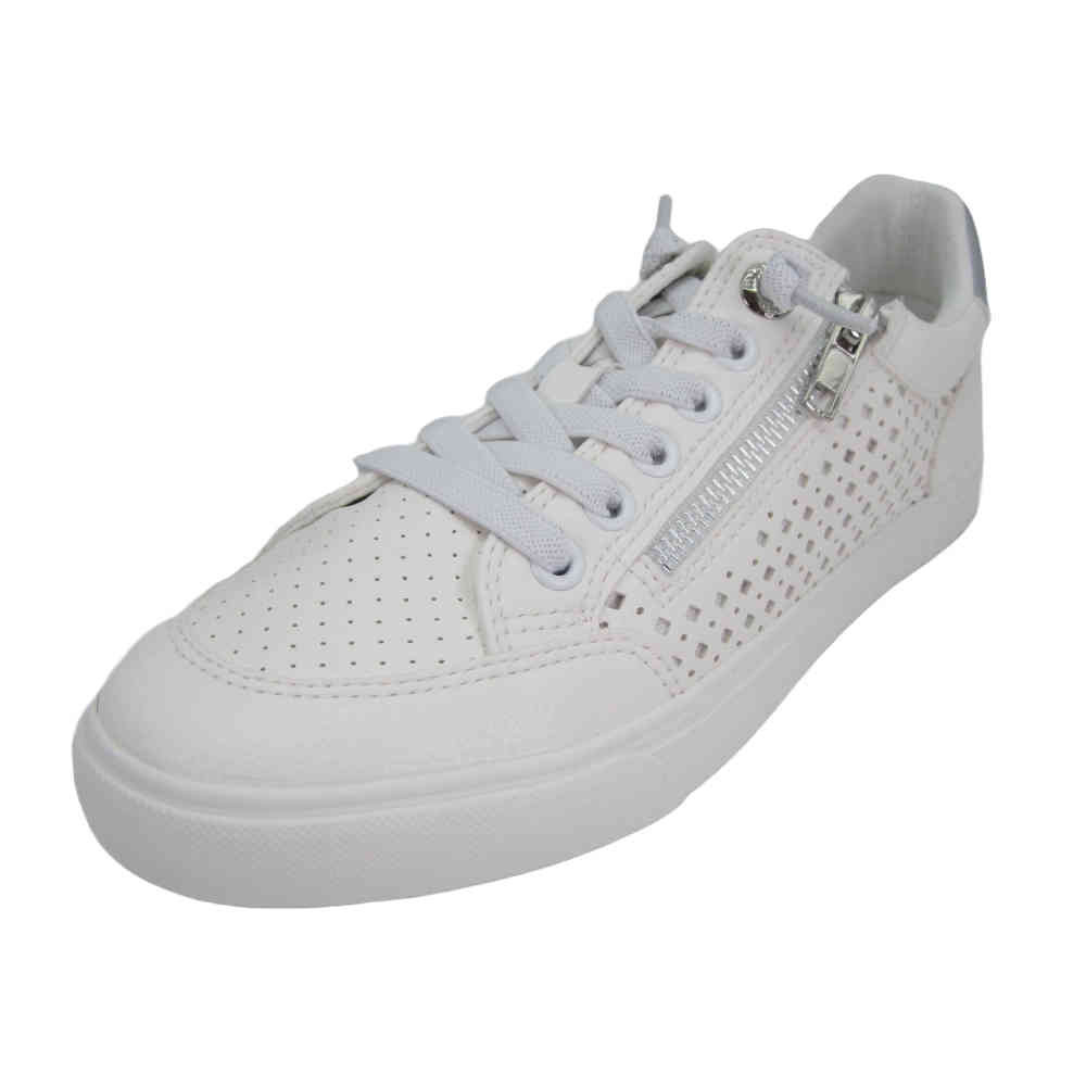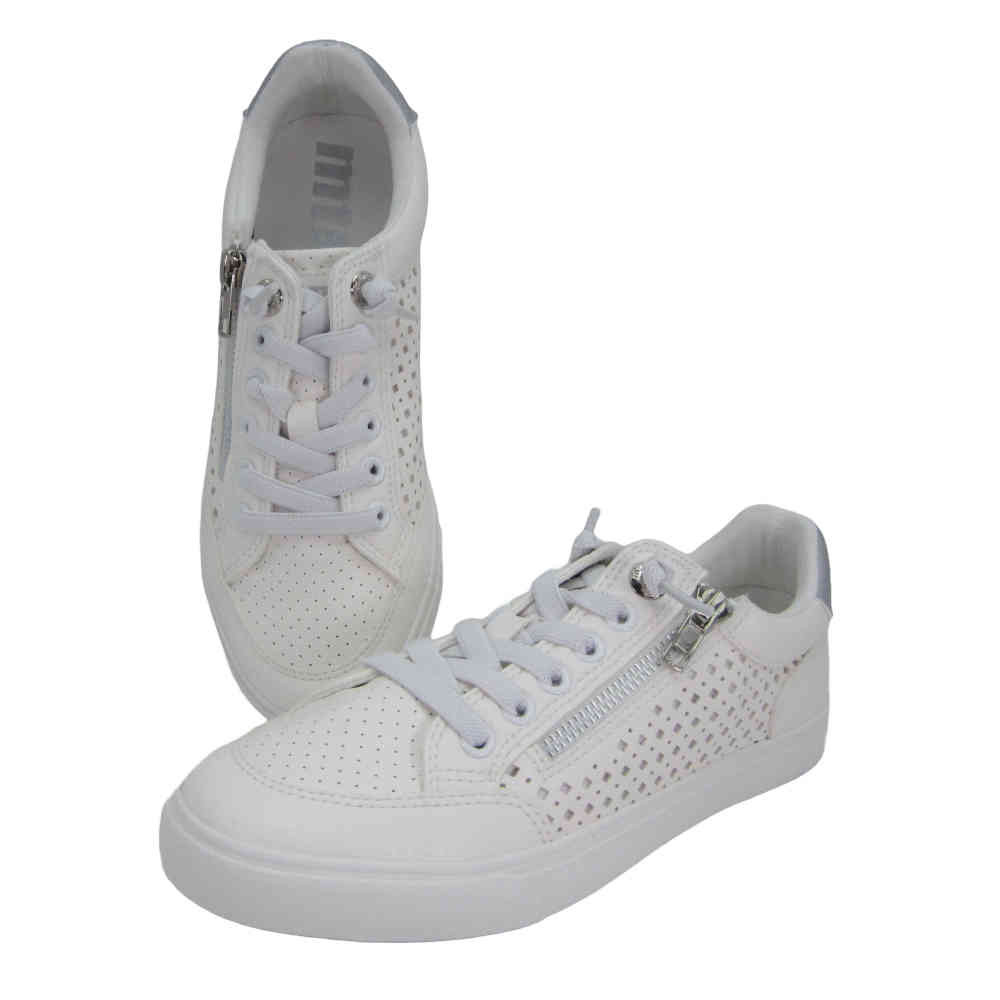 Zapatillas deportiva de mujer marca Mustang, 60710 Aria. Estas zapatillas destacan por sus perforaciones en los laterales y una cremallera dorada lateral que añade un toque de estilo. Con suela blanca y cierre de cordones, estas zapatillas son perfectas para combinar con tus outfits favoritos. Aria de Mustang es una opción versátil para tu día a día.