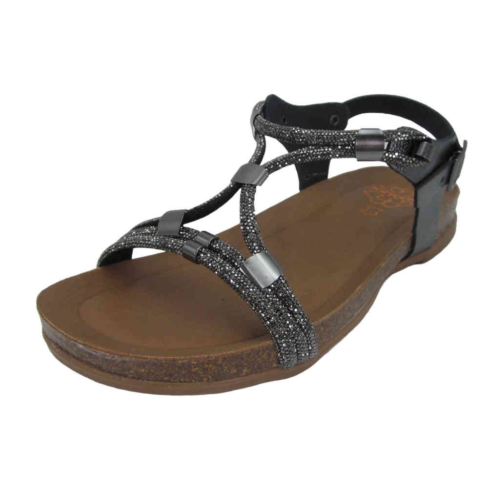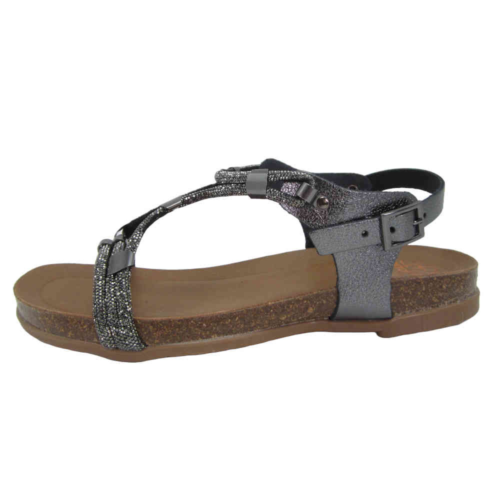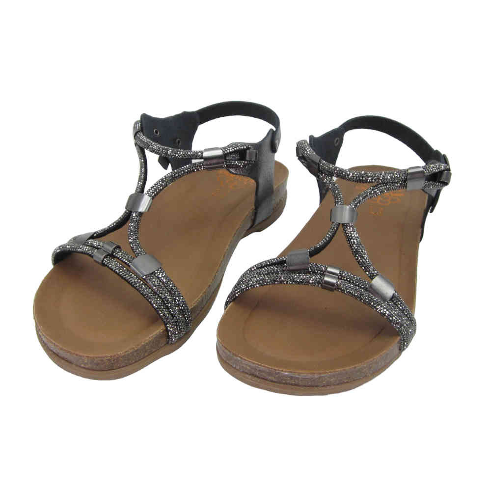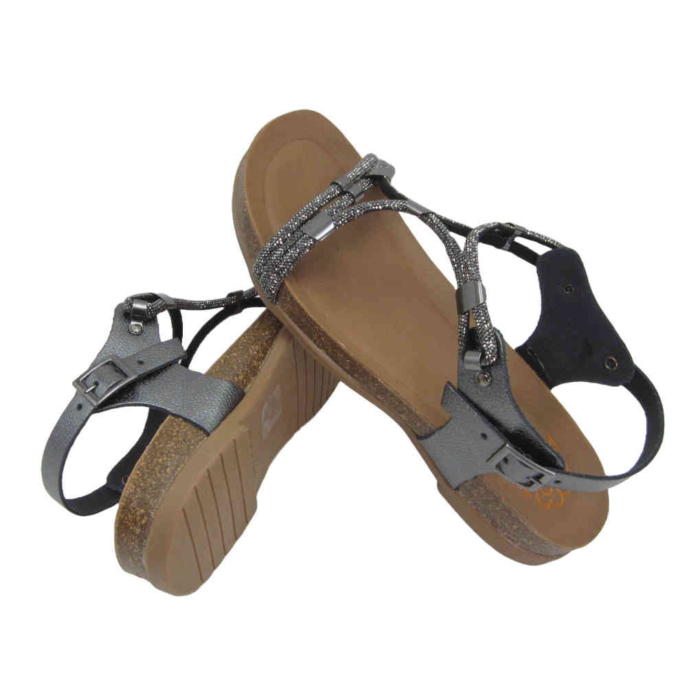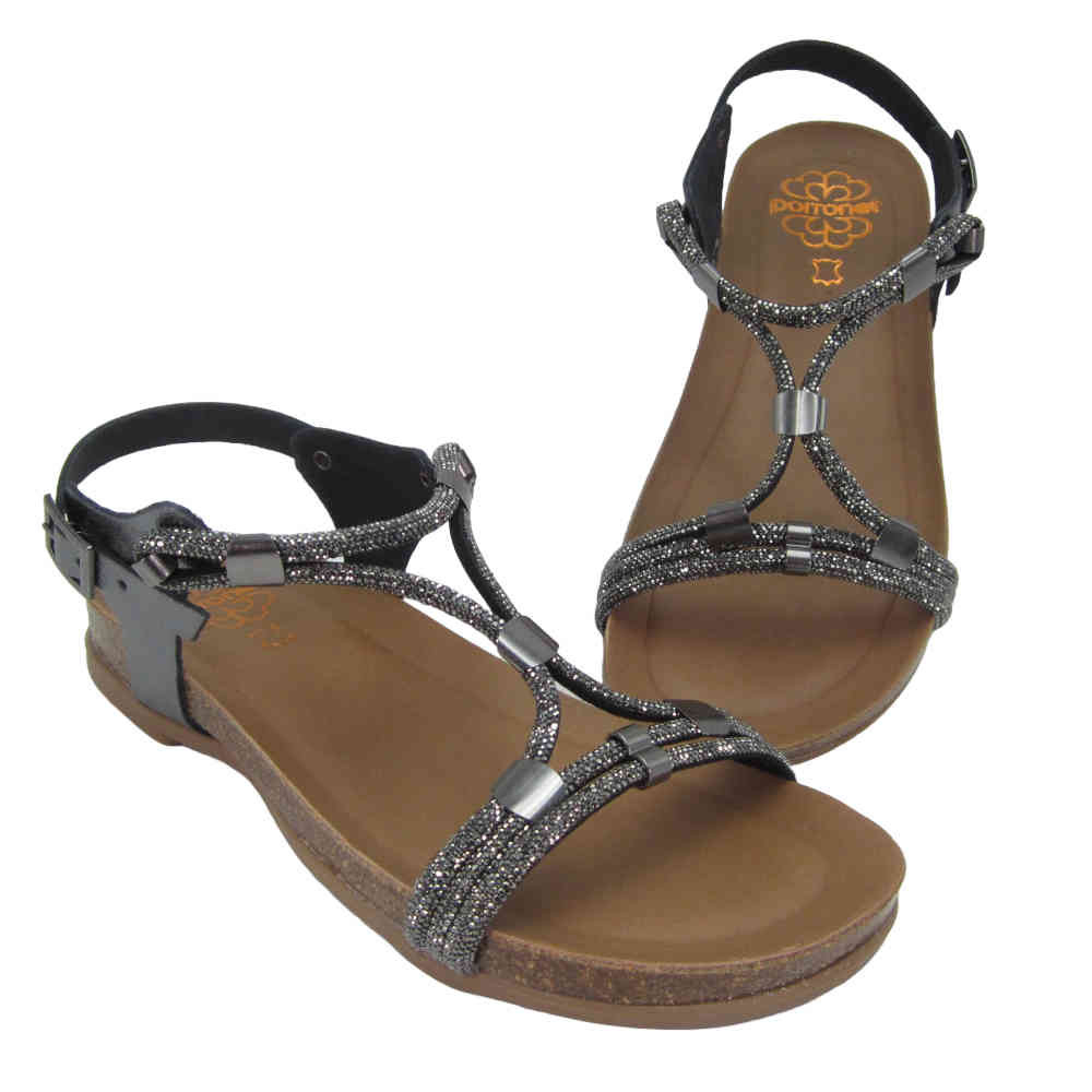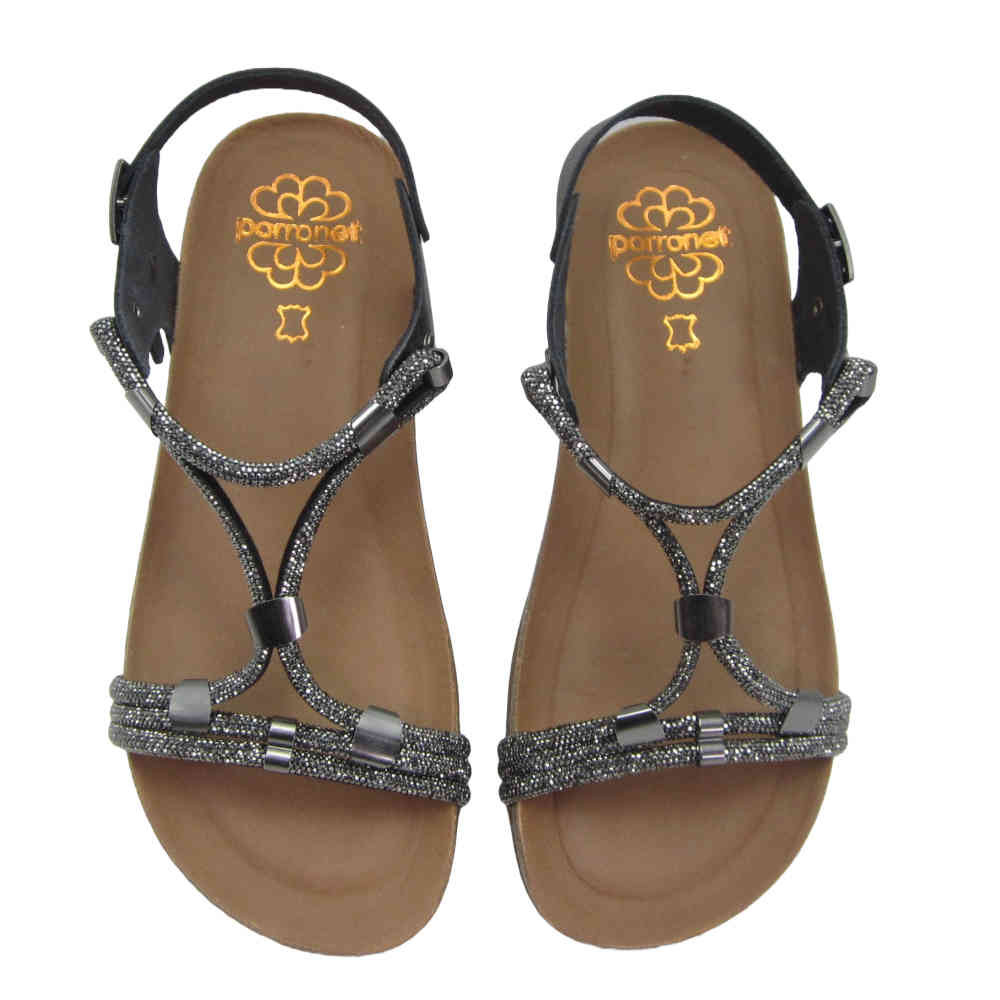 Sandalia con pala de brillantes al tono. Cierre con tira de piel ajustable al tobillo con hebilla y forro sintético transpirable. Piso de tipo bio de altura 3cm con plantilla de piel y suela de goma flexible antideslizante. Fabricado artesanalmente en España.