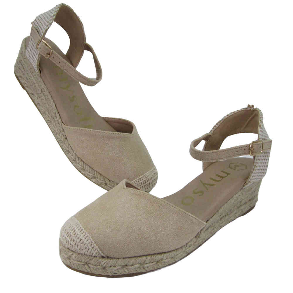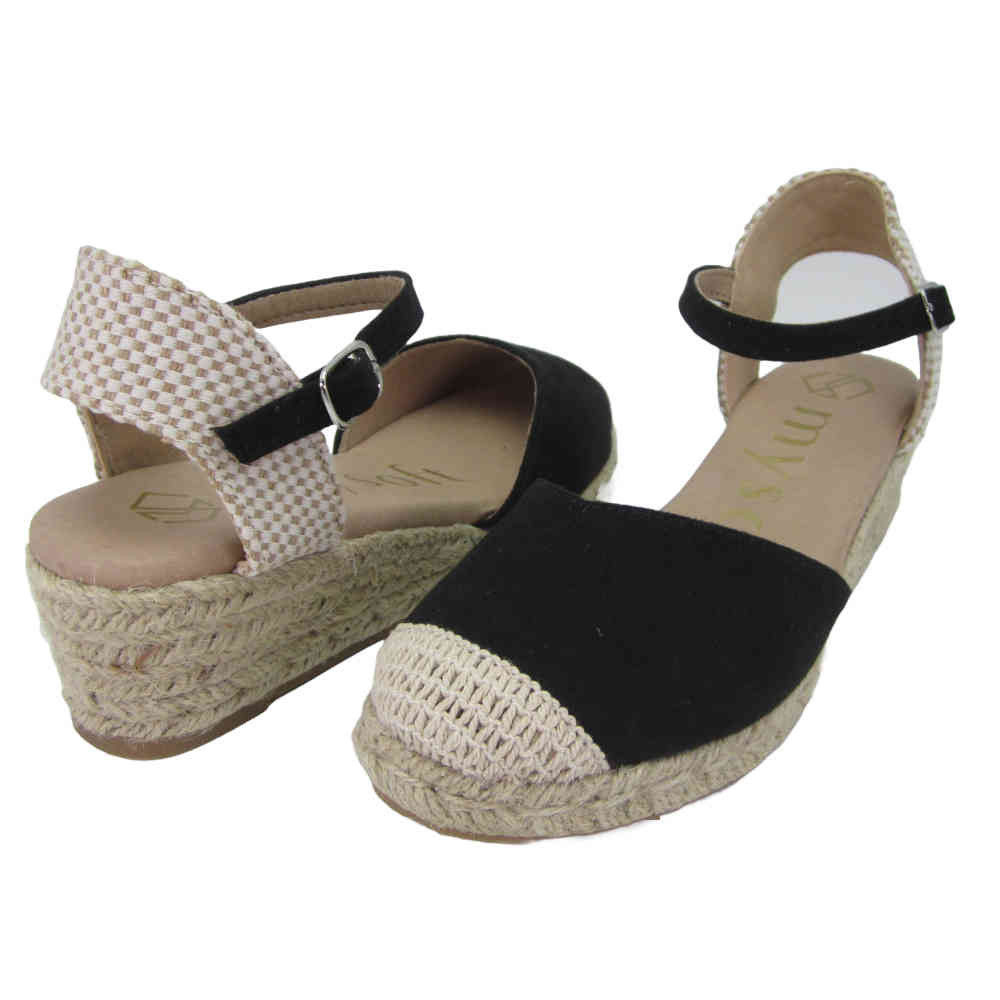 Sandalias cuña esparto de la casa Mysoft, fabricado en España con materiales veganos de buena calidad.Todo fabricado en Textil en color platino y negro con pulsera de hebilla a tono al tobillo,para fijar al pie de una manera segura .Forro vegano al igual que su plantilla, está muy mullida (Memory Foam), soft gel con nano partículas de coloide, desarrollada por técnicos alemanes, garantiza comodidad desde la primera puesta, pensada para las pisadas más exigentes.Cuña de 4-5 cm de cañamo.Suela, goma peso pluma (extra ligera).Diseño para tu día a día de gran comodidad.