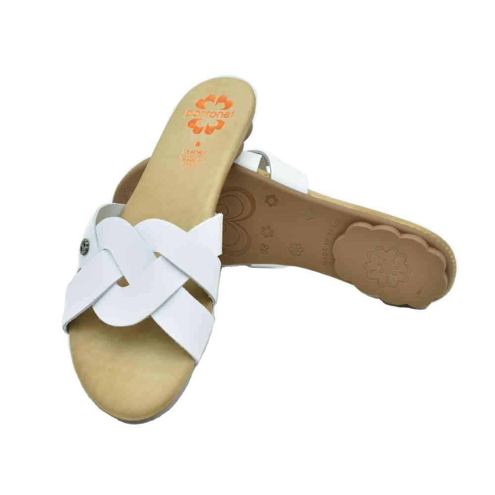 Sandalia plana de color blanco con pala cruzada. Plantilla en piel acolchada que junto al piso de goma flexible antideslizante garantiza una gran comodidad. Fabricado en España.