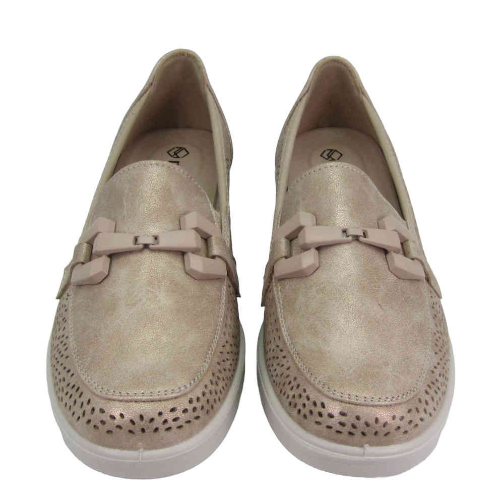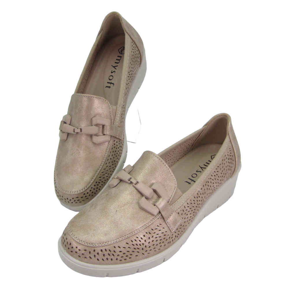 Mocasines calado de polipiel de la marca MySoft, color Nude, con cuña, con plantilla extraible de Memory foam.